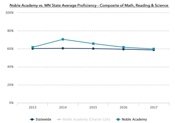 On average, Noble Academy is out performing the statewide average in composite math, reading, and science scores on state mandated testing. Given the rapid growth the school has experienced over the past five years maintaining high academic standards and results is what makes Noble Academy an astounding charter school.
