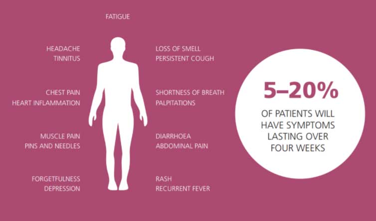 Long COVID can affect many different systems of the body. Sometimes symptoms get worse after physical or mental activities. People with long COVID report experiencing different severities and combinations of the following: