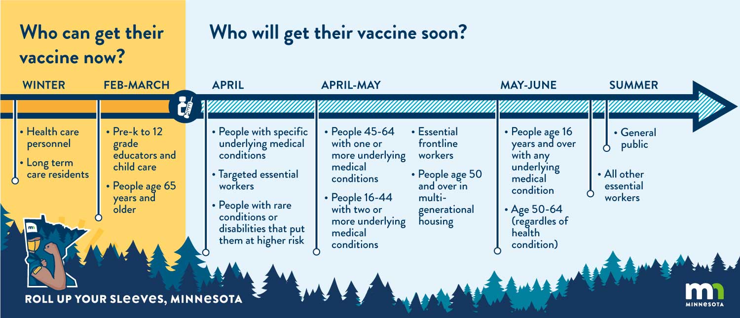 • Based on current projections, the next group of Minnesotans eligible for a vaccine will begin getting them in April, and every Minnesotan should be able to get a vaccine by this summer. Anticipated timelines are detailed on the Who’s Getting Vaccinated webpage.