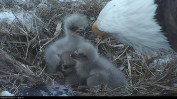 Bald eagles build bigger nests than any other birds, averaging about four or five feet in diameter. One bald eagle nest in Florida was measured at nearly 10 feet across, with an estimated weight of more than two tons. The female eagle lays two or three eggs and both parents share incubation duties. The eggs hatch after about 35 days. This year, the first egg in the EagleCam nest was laid on February 19, Presidents’ Day – a fitting birthday for America’s national bird.