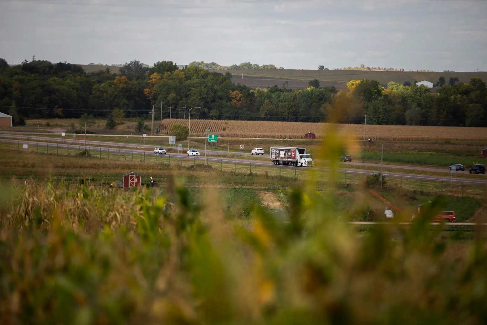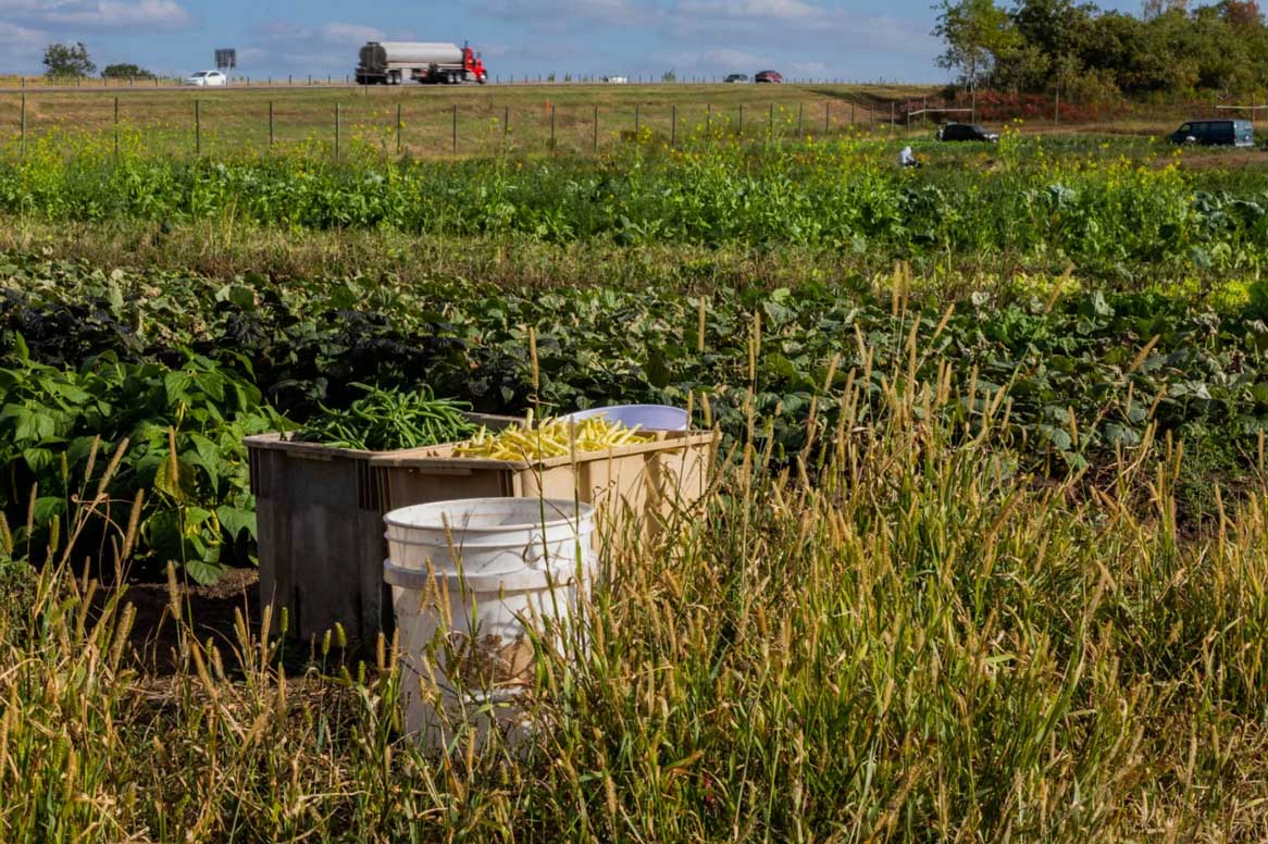 The land lies 23 miles from downtown St. Paul, and about 10 miles south from the massive Pine Bend Refinery. The farm stretches across the east and west sides of Highway 52. Neat rows of crops lie between produce-washing and storage facilities. Pollinator-friendly prairie flowers line the borders.