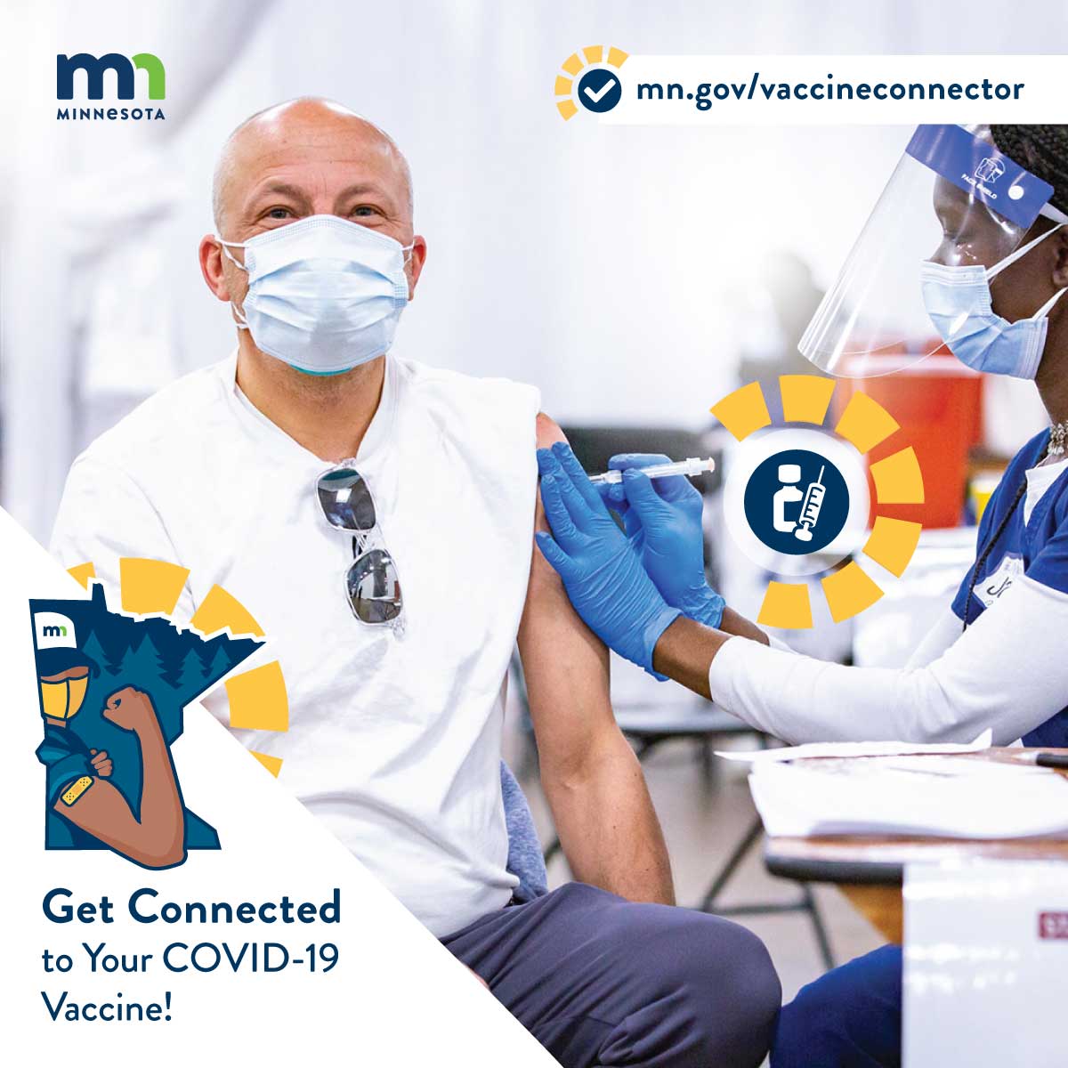 Sign up for the Vaccine Connector (mn.gov/covid19/vaccine/connector/connector.jsp) to be eligible to be randomly selected to schedule an appointment at a community vaccination location. You can find other ways to get vaccinated at Find My Vaccine (mn.gov/covid19/vaccine/find-vaccine/index.jsp). The COVID-19 vaccine is free to everyone; insurance and immigration status do not matter.