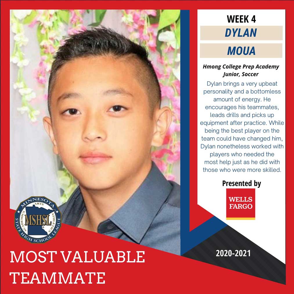 Hmong College Prep Academy Boys’ Soccer Team member Dylan Moua was recently selected as the recipient of the Minnesota State High School League Most Valuable Teammate award for the 2020 season.