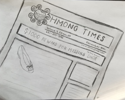 Not a week later, Nkauj Yiv went to Sun Foods on a daily run for dinner vegetables and meat portions, she picked up an issue of the Hmong Times for her own employment research. Upon quick glance at the front cover, she felt the hairs on her nape rise. She was plagued with disbelief, a bit of fury, and confusion. On the front cover was a picture of her forgotten slipper and above that a heading that read: $1,000 Reward for Missing Shoe.