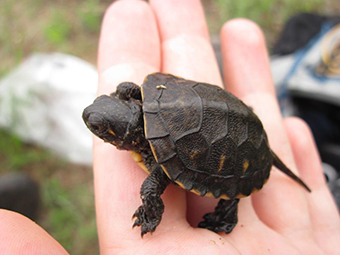 The prospects for baby turtles are grim. Eggs are often dug up and eaten by raccoons, skunks and foxes; in one study of nesting Blanding’s turtles, 93 percent of the eggs met their fate before even hatching. After they hatch – sometime between mid-August and mid-October – the baby turtles are exposed to further perils of predation and roadkill as they crawl back to water, where they still may be eaten by large fish. Even if they do survive to adulthood, turtles don’t reach sexual maturity (the age when they start reproducing) until they’re between 5 and 15 years old, depending on species.